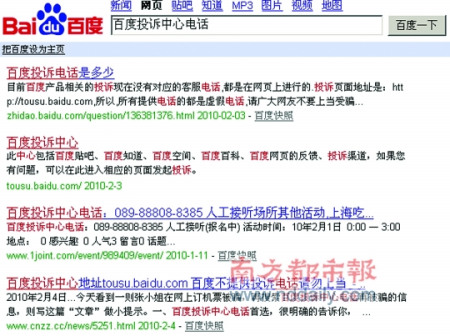 事態(tài)記者楊濤 報道 昨日,本報報道了山寨“百度投訴電話”被百度搜索置頂?shù)碾x奇事件,昨日,記者追訪此事時發(fā)現(xiàn),電話區(qū)號為“0898”的山寨“百度投訴中心”已經不再置頂,但昨日晚間搜索時,該網站仍然位列搜索結果的第三位。只是隨后的一條搜索結果提醒用戶,“百度不提供投訴電話,請勿上當”。被騙的張小姐得知此消息后亦哭笑不得。她表示對此事報警的目的不在于索賠,但網絡的管理實在有待加強。