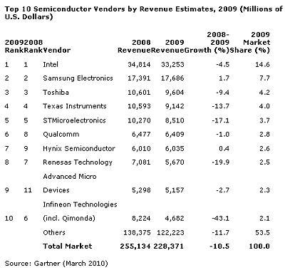 第六至第十位排名依次為高通、Hynix、Renesas、英飛凌和奇夢達,市場份額分別為2.8%、2.6%、2.5%、2.3%和2.1%。