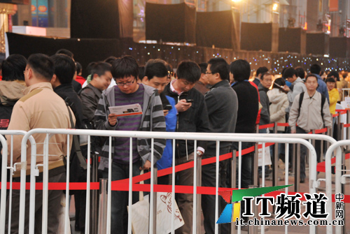 中新網10月30日電 中國聯通iPhone手機今日正式發布,首售儀式將于今日18時至次日凌晨在北京“世貿天階”舉行。記者在現場看到,雖然今晚天氣寒冷,但已經有近300名消費者在現場排隊等候購買聯通iPhone手機。