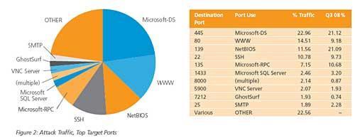 攻擊針對20800個獨立端口,相當(dāng)于第三季度的8倍多。其中,針對445端口(Microsoft-DS)的攻擊最多,約占來自美國和俄羅斯的25%