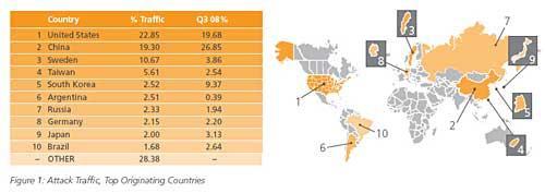 據(jù)國外媒體報道,2008年第四季度,美國首次成為全球最大的黑客攻擊源,中國和瑞典分列二、三位。中國臺灣和韓國也位列前十。