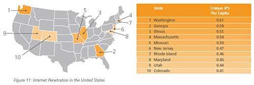 東部地區最高占7席,從2008年一季度到四季度,內布拉斯加州和肯塔基州速度有33%的改善