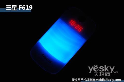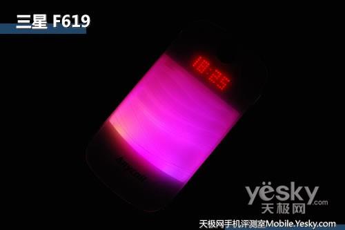 三星F619手機機身正面加蓋了水晶殼,在其下隱藏著七彩瀑布燈與LED數字燈光(在手機設置中,LED數字燈光被稱之為魔力亮點),在來電、短信或者播放音樂時,外部瀑布燈都會有相應的事件啟動。
