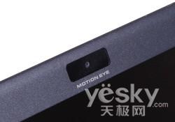 前面我們已經對它頂蓋材料做過介紹,這種碳纖維選材結合LED背光能夠讓屏幕做得非常纖薄,側面厚度僅有5毫米。屏幕邊框同樣也采用這種合成材料,邊框設計很窄,在上方增加了六個膠皮墊腳,起保護屏幕的作用。在屏幕上方設計了一顆攝像頭,其有效像素為640×480,可以滿足一般網絡視頻需求。