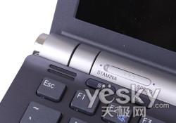 轉軸部分有一個STAMINA和SPEED模式切換鍵,這個切換鍵是專門針對這款機器獨特配置所設計的,由于Z55配備了雙顯卡,并且NVIDIA與IntelX4500并不支持熱切換,為了在省電和性能之間方便切換,索尼Z55加入了這個按鍵,在“持久(STAMINA)模式”中,它使用的是集成顯卡(移動式英特爾®圖形媒體加速器 4500MHD)。而在“(SPEED)模式”中,VAIO Z5系列使用的是獨立顯卡(NVIDIA GeForce 9300M GS (GPU) 顯卡,用戶可根據實際需求,在使用中做不同模式切換。
