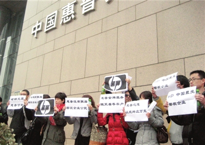 當(dāng)天上午10點(diǎn)半左右,在國(guó)貿(mào)橋東南角的中國(guó)惠普大廈門前,十余名消費(fèi)者手舉自制的紙牌抗議,引來(lái)路人圍觀。紙牌上寫著“蟑螂無(wú)罪惠普可恥”、“HP,中國(guó)最受鄙視企業(yè)”、“惠普之道,以狡辯應(yīng)萬(wàn)變”等口號(hào)。抗議進(jìn)行了10分鐘左右,消費(fèi)者來(lái)到中國(guó)惠普大廈的8層,看到“惠普解決方案體驗(yàn)中心”的招牌后,消費(fèi)者又舉起紙牌進(jìn)行抗議,并要求與售后總監(jiān)談判。11點(diǎn)左右,惠普售后總監(jiān)陳女士來(lái)到現(xiàn)場(chǎng)。