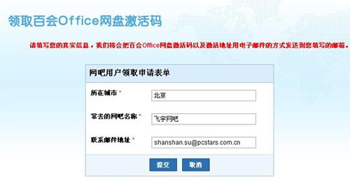 點(diǎn)擊進(jìn)入,按照提示輸入所在地、常去的網(wǎng)吧名稱、聯(lián)系郵箱地址提交后,剩下的工作就是等待百會(huì)客服人員將激活碼發(fā)送到所填寫的聯(lián)系郵箱地址。這里需要提醒,填寫的郵箱地址一定要正確,不然就無法正常的接收到百會(huì)Office 5G網(wǎng)盤激活碼了。