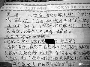 中學(xué)生,甚至是小學(xué)生的“早戀”已不是什么值得大驚小怪的事情了,然而在看了網(wǎng)友“typhooncome”于日前發(fā)出的“雷死人的六年級(jí)小學(xué)生的字條”一帖中,幾張兩個(gè)六年級(jí)小學(xué)生互相“傳遞愛(ài)語(yǔ)”的字條后,記者還是著實(shí)被雷了一把,其中的內(nèi)容和用詞就如發(fā)帖者所說(shuō)的一樣“非常非常雷人”。
