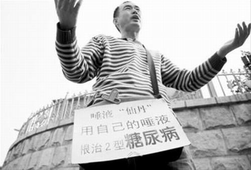 “唾液‘仙丹’”、“用自己的唾液”、“根治2型糖尿病”,連日來,一名30歲左右的男子,背著一個貼有“根治糖尿病”字樣的挎包,在人民廣場徘徊。他自稱推廣糖尿病的新療法,卻不愿詳述治療原理,在眾人面前做廣告,又不愿透露自己的身份。