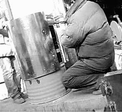 昨天(12月24日),記者來到天橋區臧家屯小區附近,一條街旁有幾家加工鐵爐子的業戶,其中一家業戶前擺著一些大鐵桶,業戶在一個藍色的大鐵桶前忙活著。記者走近一看,業戶在加工地瓜烤爐,他給藍色的大鐵桶包上半米高的白色鐵皮!澳氵@里加工地瓜烤爐嗎?多少錢一個?”記者問!300多元一個!睒I戶指著正在加工的大鐵桶說,“這個烤爐已經有人買了,你如果想要烤爐,先挑個鐵桶吧!