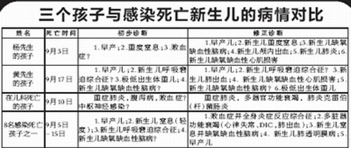家屬們認為,兩位孩子死亡癥狀與公布的8名死亡患兒驚人地相似(見左表),醫院感染問題應該不只是這11天,以這么具體的時間劃分孩子的死因,顯然違背科學精神。