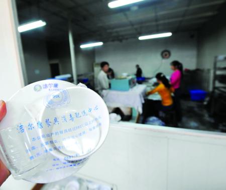 “這些餐具你們自己用不用?”面對工商執法人員的詢問,一名正在清洗“消毒餐具”的女工沉默半晌后搖了搖頭,小聲地說:“我不用。”27日中午,接到記者反映的情況后,工商部門查處了位于福州晉安區譚橋村的這家消毒餐具廠。記者看到,這家廠的餐具包裝袋上印著“潔爾康餐具消毒配送中心”字樣。