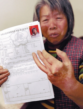 若干年前的一次工傷,讓沈河區北二經街的居民王桂蘭成為國家三級肢殘。但這一事實在上周五被“改變”了,在經歷了一次新殘疾證換證的例行體檢之后,60歲的王桂蘭被醫生告知,她已經是“正常人”了。這一結果讓王桂蘭大惑不解,她舉著殘廢的左手質問醫生,“為啥?”醫生回答:“你必須手指頭全沒了才能算殘疾。”