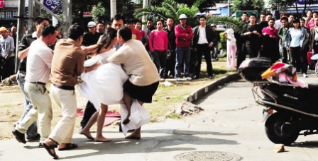 民警趕到現(xiàn)場后安撫女子,女子一手抓了一塊磚頭說,“誰要我穿衣服,我就砸誰!”說完她將磚頭砸向人群。民警伺機而上,用床單將女子裹住。20分鐘后,女子被民警帶走,一名七八十歲的老人也跟著上警車。