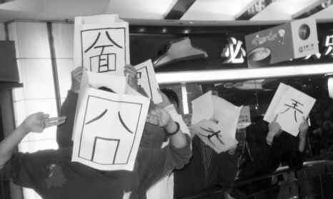 “可以看作是一種解壓方式,一種發泄吧,這些詞能代表現現代白領的各種心態,例如‘囧’代表郁悶、‘烎’代表不服輸的精神等等。”MK說,他會在廣州六個白領出現較多的地方進行這樣的表演,還打算將這些表演做成視頻放到網上去。