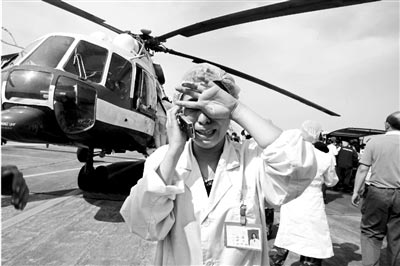 昨天下午4點05分,東方通用航空公司的一架米1-71直升機(jī)緩緩降落在廣漢機(jī)場停機(jī)坪上。艙門打開,40歲的女護(hù)士杜娟下了飛機(jī),招呼著成都120急救中心的醫(yī)護(hù)人員將傷員抬到急救車上。杜娟是北川縣禹里羌族鄉(xiāng)衛(wèi)生院的護(hù)士。5·12地震后,禹里與世隔絕,直到昨天才等到直升機(jī)將重傷者送出。杜娟隨機(jī)照顧患者。傷員都下了飛機(jī)后,杜娟向于波借手機(jī),電話打通時,她手開始顫抖,撕心裂肺的哭聲終于無法忍住。那是她六天后,第一次給外面的親人打電話。巨大的螺旋槳轉(zhuǎn)動聲中,人們只能依稀聽到她的哭訴:“我要去找他,不能連個尸體都沒有。”于波默默地看著她,不到一個小時前,他還覺得這個女護(hù)士嚴(yán)厲得有點過分。