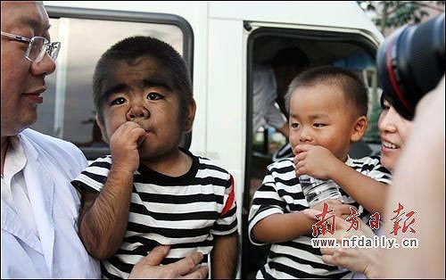 小文才的雙胞胎兄弟身上沒有多毛的癥狀。昨日,深圳一醫院醫療專家組專程將“毛孩”文才,和同樣“長毛”的爺爺、爸爸、姑姑接到深圳,開始免費的長期外形和心理救助治療。記者何俊攝