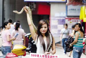 這名自稱叫“優優”的年輕女子說,她今年22歲,陜西人,曾是專業舞蹈演員。她從小不怕蛇,3年前自己養起了蛇,剛開始由于缺乏專業養殖知識,死了好幾條蛇,她為此十分難過。現在她對“蛇性”相當了解,還學起了蛇舞、印度舞、肚皮舞。優優指指脖子上的蛇稱,這是條緬甸蟒,10多斤重,進食胃口很大,不僅要吃豬肉,而且一次能吃七八只和鴿子差不多大小的鳥。由于養蛇,這幾年來優優一直單獨一人居住,“沒幾個人不怕蛇的,我只能帶著蛇單獨過。”帶蛇來“逛”山西路,優優另有目的,她背后的胡導稱,他計劃花5年時間搜集500個奇人,拍攝奇人喜劇電影,讓他們展示各自絕技,目前有人愿出數百萬拍攝。