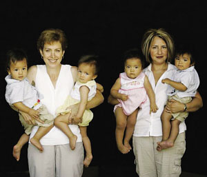 瑪莎和凱倫抱著她們的奇跡四胞胎。