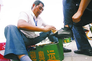 熱心牙醫在北京奧運場館旁免費為路人擦鞋(圖)