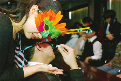 參加者都用眼罩蒙住眼睛,再戴上面具。然后,屋里關燈,每個人仔細甄別異性散發(fā)出來的氣味。如果女士找到屬于自己味道的男士,就可以輕拍他三下,邀請其參加接下來的活動。雙方蒙眼參加“心有靈犀”、“危情應對”等一系列的活動之后,選定情侶并將定情鎖送給對方作為信物。