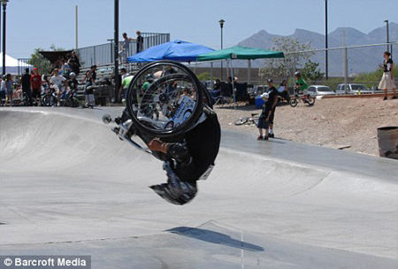 現(xiàn)年16歲的亞倫·佛斯靈漢姆(Aaron Fotheringham)被朋友們稱作“車輪” 。1991年11月出生在美國(guó)內(nèi)華達(dá)州的拉斯維加斯的他,患有脊柱分裂的先天疾病, 從3歲起就不得不依靠輪椅生活。但是,他卻成為了輪椅上完成后空翻高難度動(dòng)作的第一人(目前唯一的一個(gè)),他也因這一壯舉在2008年10月入選了吉尼斯世界紀(jì)錄。