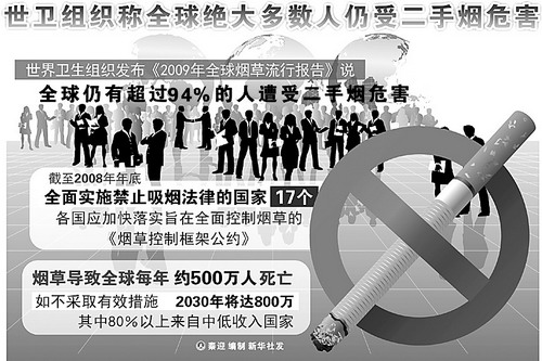 2008年10月30日,來自全國的400家環保民間組織的代表在北京發出共同聲音:吸煙是污染環境的行為,應當維護被動吸煙者、維護環境的合法權益。他們呼吁盡快制定并頒布控煙特別是公共場所禁煙的法律、法規,并有效監督實施。根據中華環保聯合會《被動吸煙的調查問卷報告》,85%的受調查公眾不清楚被動吸煙對人體健康造成危害的嚴重性。而目前,我國的吸煙人數達到3.5億,被動吸煙人數高達5.4億。我國于2003年11月10日簽署了世界衛生組織的《煙草控制框架公約》,2006年1月9日,該《公約》在我國生效。