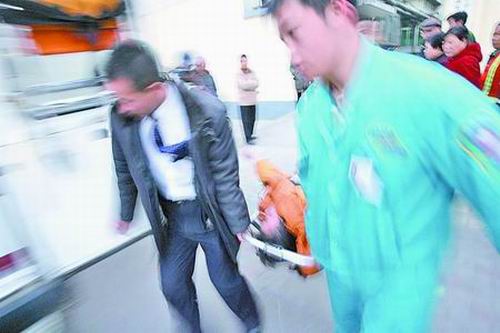 嘔吐的張某被抬上急救車 李文波 圖