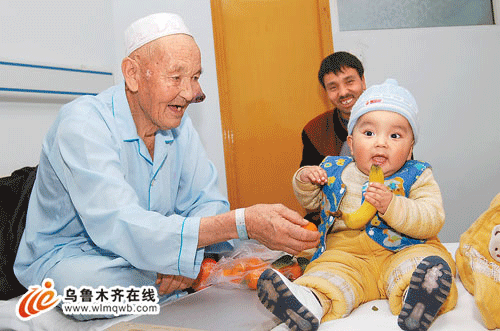 老人說,自己是阿克蘇烏什縣的農民,身份證上顯示95歲,實際上自己今年已經103歲了。他共有12個子女,其中有9個已經辭世,最小的兒子今年36歲,現在共有11個孫子孫女,最小的孫子目前不滿1歲。