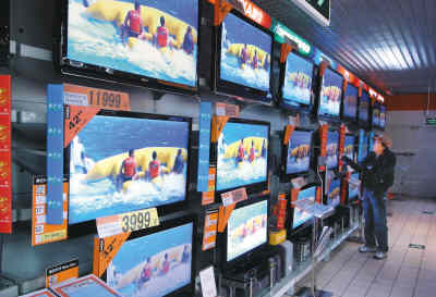 如今的電器商場(chǎng)里,各式各樣的超薄電視隨處可見(jiàn)。人民日?qǐng)?bào)記者 李石營(yíng)攝