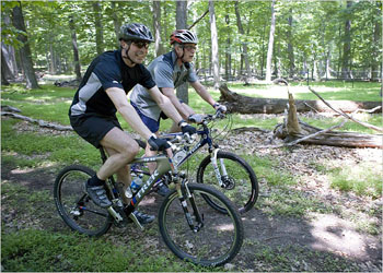 美國(guó)總統(tǒng)和丹麥?zhǔn)紫嗬鼓飞黄痱T車。后者曾嘗試了去年環(huán)法自行車賽的一段艱難上坡路段。