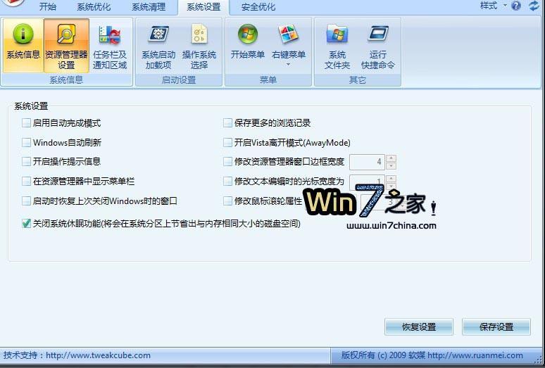 此外,從Vista時代,由于睡眠功能的存在,休眠功能其實已經趨向于可有可無了,同時,禁用休眠功能還可以節省出于內存同等大小的硬盤空間,因此,我們建議大家使用Windows 7優化大師 (點此下載) 或魔方 (點此下載)中的系統設置關閉休眠功能。