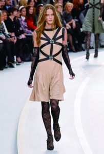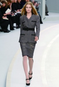 2008年Chanel的秋冬時裝秀場上,卡爾·拉格斐在秉承Coco Chanel“貧窮的奢華”的原則下,刻意給斜紋軟呢外套加上了抽線設計,拼接的碎布在手肘、口袋與短裙上隨處可見。不收邊的剪裁效果,充滿搖滾興味,戲劇化的荷葉邊、充滿立體感的打褶剪裁與布料上的紋路,成為Chanel本季的設計主軸。