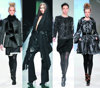 1.在色彩都選用黑白色系的同時,服裝面料的多元化搭配成為取勝關鍵,以不同色度、材質的黑色呈現出質感與光效的微妙對比,比如絲與閃光的亮片,法蘭絨和色丁,天鵝絨與閃光提花的對比效果。