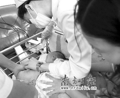 今年9月5日,化州市笪橋鎮一婦女產下一對連體女嬰。9月8日,連體女嬰被送到深圳市兒童醫院檢查治療。經醫院檢查發現,連體姐妹各自擁有一個肝臟,只是兩個肝臟連在一起,分離手術的成功率很大。院方決定前日上午9時進行手術。