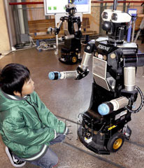 據日本共同社報道,原來這是國際電氣通信基礎技術研究所(ATR,京都府精華町)等單位開展的一項機器人試驗項目。身高114厘米的“Robovie-II”機器人擅長“察言觀色”,對于猶豫不定的客人,它會一邊招手一邊接近客人,詢問“需要幫忙嗎?”,隨后用聲音或動作帶客人前往想去的地方。
