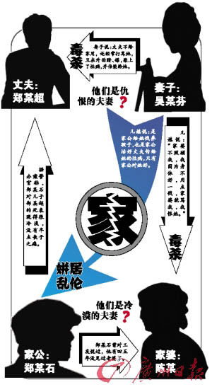 7月12日,廣西桂平人鄭某超開(kāi)摩托車途經(jīng)封開(kāi)時(shí)中毒身亡,妻子吳某芬不知去向。鄭某超一家的禍?zhǔn)乱患右患碓趶V州番禺打工的鄭母也離奇失蹤。專案組的民警通過(guò)近4個(gè)月的取證和調(diào)查,案情終于水落石出。11月,兇手吳某芬在湖南被抓,其對(duì)殺害丈夫與婆婆的犯罪事實(shí)供認(rèn)不諱。據(jù)吳某芬交代,她之所以下此毒手,源于家庭不和,丈夫與婆婆對(duì)她不好,讓她記恨在心。一幕謀殺親夫、加害婆婆、與家公通奸的家庭悲劇由此而上演。封開(kāi)警方昨日公布的這一案情讓人看后感慨萬(wàn)千。