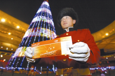 國家體育場“鳥巢”昨起正式啟用新票樣。此外,從昨天起到明年1月10日,“鳥巢”每天的閉場時間將延后一小時,由原來的18時延長至19時。(金可/攝)