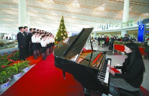 昨日(12月25日),首都機場3號航站樓內,旅客在合唱團伴奏下跳舞。當日,機場在2、3號航站樓增加“文化國門”系列演出,30名機場員工組成的合唱團參演。機場負責人表示,2009年起,每逢重大節日、旅客進出港高峰期,機場都將邀請外界演出團體或發動內部員工表演等,為旅客提供文化表演。(李立強 通訊員荊雷 攝影報道)