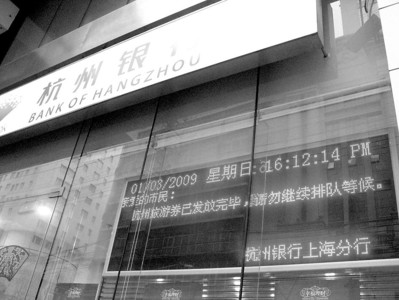 見(jiàn)到如此場(chǎng)面,杭州銀行決定提前1小時(shí)開(kāi)始派發(fā)。杭州銀行上海分行新聞發(fā)言人邵燕敏告訴記者,為避免現(xiàn)場(chǎng)混亂,銀行每次允許10人進(jìn)入現(xiàn)場(chǎng)并憑身份證領(lǐng)取消費(fèi)券。但在派發(fā)開(kāi)始半個(gè)多小時(shí)后,銀行工作人員通知排隊(duì)者,旅游券就快領(lǐng)完,排在后面的市民可以不用再等了。