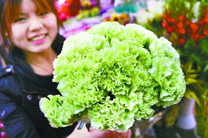 綠色代表健康、充滿活力。大家通常看到的康乃馨大都是紅、黃、粉為主,綠色康乃馨因培植技術復雜等原因,極其罕見。在追求環保、簡約、時尚的三八婦女節為女性朋友送上一束綠色的康乃馨別有一番寓意。(劉潔攝)