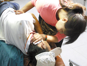 昨日下午3點多鐘,脖子血流不止的周方被救護車送進市急救中心后拒絕進入急診室接受治療。記者看到,周方的脖子左側有一道長約6公分的刀傷,鮮血直流,染紅了白色T恤和頭上的棒球帽。醫(yī)護人員和匡非好不容易將他勸進去,他卻趴在病床上痛哭不已,約10分鐘后,才平靜下來,接受了縫合處理。據(jù)醫(yī)生介紹,周方的傷口淺,未傷及主動脈,無生命危險。
