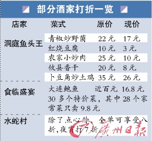 “最近上酒樓吃飯便宜了。”家住海珠區(qū)的李小姐告訴記者,下渡路的渝風(fēng)樓,原先賣38元的酸菜魚、跳水蛙都降到18元,經(jīng)常看到幾個(gè)年輕人就圍著兩大盤這樣的菜式,再叫個(gè)飯就可以完成一餐,很劃算。