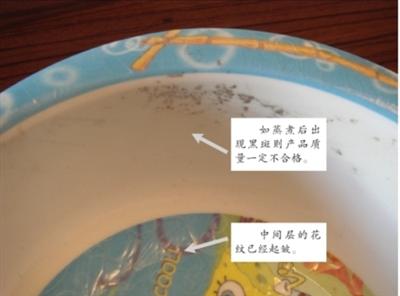 或者,您也可以參照《QB 1999—94密胺塑料餐具》標準中耐濕熱性的試驗方法,把餐具放在沸水中浸煮30分鐘后取出,在室溫中放置一小時,重復3次后,如果餐具出現發白、發澀、起泡、開裂以及有刺鼻氣味等現象,說明餐具產品質量存在問題。