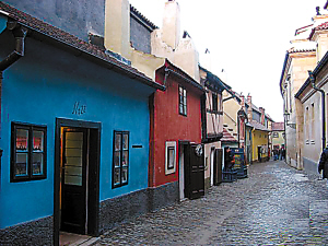 從修道院通往城堡的小街居然就是著名的黃金小巷。這巷子的出名其實(shí)是因?yàn)榭ǚ蚩ㄔ?jīng)住在這里,并完成了我們熟悉的小說《城堡》。黃金巷是一條由磚石鋪成的街道,街道很窄,原是皇室仆役聚居的處所,后來這里聚集了很多煉金術(shù)師,黃金巷由此得名。