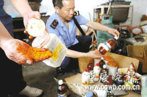 記者現場看到,該作坊位于一棟3層民房內,1樓專門設計了一個狹長的車庫,打開卷簾門可以直接將貨車倒入房間內裝貨,非常隱蔽。3樓除了工人生活房間外,有一間房里堆滿各種包裝紙箱、包裝袋,以及已經使用過的各種不明食品添加劑,估計其中可能有日落黃、檸檬黃等國家限制使用的色素以及燒堿等。執法人員將色素瓶蓋打開,鮮艷的色素很快染紅了執法人員的雙手。雷所長介紹,這些色素具體是什么成分,可否添加入食品,食用后對人體有無害處還有待技術檢驗。