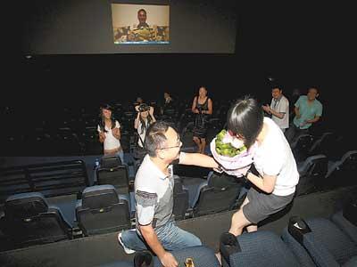 原來,80后的李燦悄悄邀約好友助陣,包下影院策劃出了這個(gè)浪漫的求婚儀式。