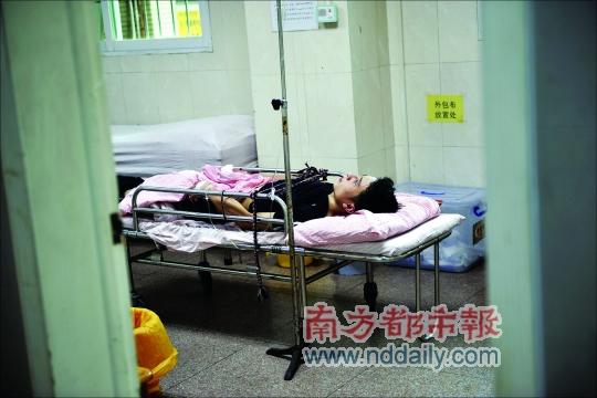 在番禺市橋醫院急診室內,撞車男子躺在病床上接受治療,為了保證安全,警察用繩索將其身體固定起來。男子情緒已趨于穩定,只是因為之前的撞擊,頭部有明顯傷口。