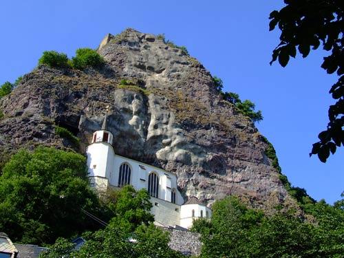 巖石教堂位于德國風景優(yōu)美的伊達爾—奧伯施泰因小鎮(zhèn)旁。這里是德國著名的寶石之鄉(xiāng)。走在小鎮(zhèn)的石板路上,記者老遠就看到鎮(zhèn)外山上巖石峭壁上的白色小教堂。