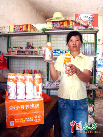 當日上午,記者驅車來到墩上村實地采訪。今年41歲的鄒根枝兒女都在外務工,和丈夫鄒新海兩人在家幫人裝殼子板,每天120多元的收入讓兩人很是滿足,平時除了吃飯外還特意買些原料補充營養。鄒根枝介紹說:“6月20日,我從墩上村鄒德水的便利店里買來一箱娃哈哈營養快線,當時怕飲料不新鮮,還特意看了生產日期,見是2009年5月31日生產的才放心買了回去,放在家里晚上看電視的時候喝,有些時候我老公(鄒新海)也喝一瓶,但沒有我喝得多。幾天后,我感覺肚子不舒服,上吐下瀉,為此專程搭車到萬年縣石鎮街去買胃藥,花了差不多200元錢病情卻不見好轉,而且肚子痛得特別厲害。沒有辦法,我只好到屋前的墩上衛生所去看病,打了幾天吊針以后病情才有所好轉。這次看病不僅花費了近400元醫藥費,還耽誤了一個多星期沒有干活,就連前兩天插秧都是請人干得,我的損失可大了。”